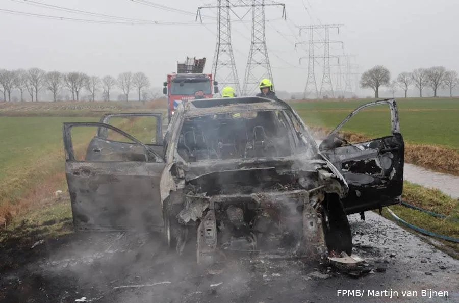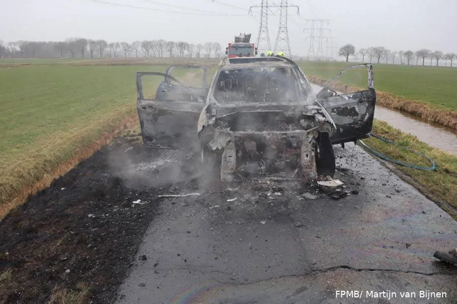 Twee inzittenden van een Jeep kregen maandag aan het begin van de middag de schrik van hun leven. Ze reden over de Vogelenzangweg in polder tussen s' Gravenmoer en Waspik toen ze een rare klap hoorde en niet veel later vloog de Jeep in brand.