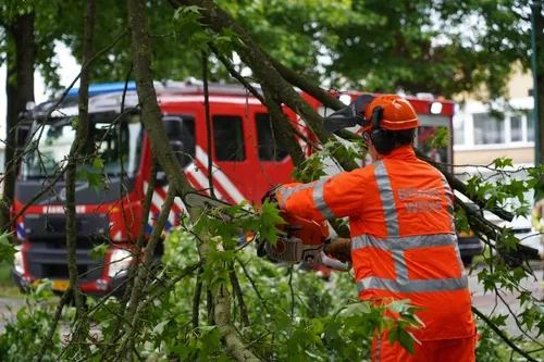De brandweer kwam in actie om deze grote tak te verwijderen. De tak werd in stukken gezaagd en aan de kant gelegd.