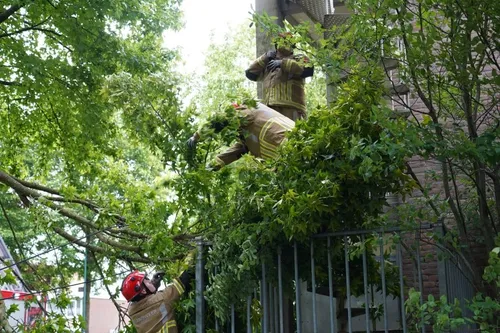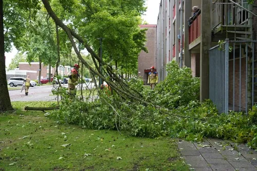 Tijdens de storm van maandagmiddag brak een grote tak van een boom af en belandde op de galerij van een flat aan de Rijnstraat.