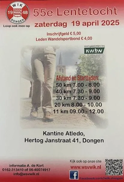 Op zaterdag 19 april organiseert wandelvereniging WIK voor de 55e keer de Lentetocht. Deze voorjaarsklassieker trekt jaarlijks vele wandelliefhebbers uit de regio naar Dongen voor een sportieve en gezellige dag.