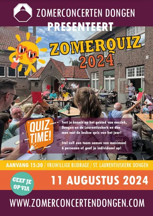 Stel een leuk team samen en geef je op! Geen team? Geen probleem, geef je dan op als individu en je wordt dan in een team ingedeeld. Opgeven kan via www.zomerconcertendongen.com Teams mogen uit maximaal 6 deelnemers bestaan. En let op! Er zijn slechts 60 plekken om deel te nemen! De Zomerquiz maakt onderdeel uit van de Zomerconcerten Dongen. Een reeks concerten die jaarlijks in de zomer in de St. Laurentiuskerk in Dongen wordt georganiseerd.