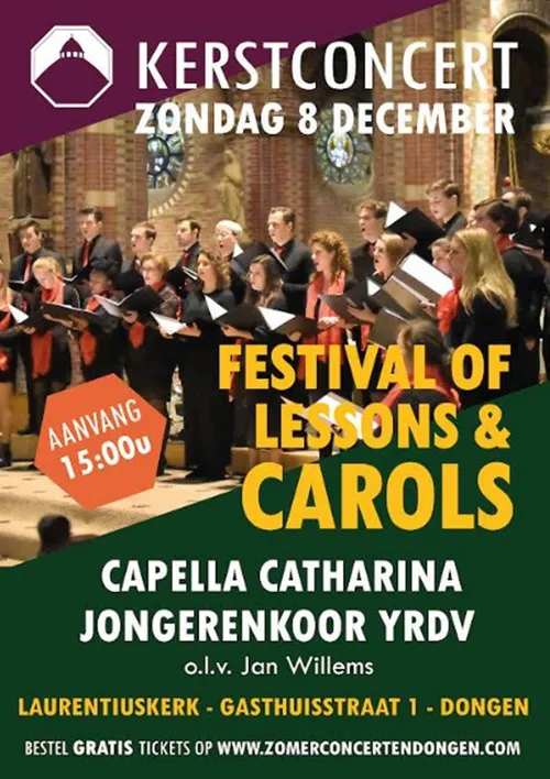 Een kerstconcert naar Engelse traditie. Lezingen (Lessons) en kerstliederen (Carols) wisselen elkaar af en vertellen zo samen het kerstverhaal. Het beroemde Choir of King’s College in Cambridge staat ook bekend om hun uitvoering van A Festival of Nine Lessons & Carols. Op veel plekken wordt deze traditie nu voortgezet. En nu dus ook in Dongen. Er klinkt muziek van componisten Willcocks, Tavener, Ledger, Vaughan Williams, Rutter en Stopford. Uiteraard komt er ook bekende kerstmuziek voorbij, waarbij het publiek kan meezingen.