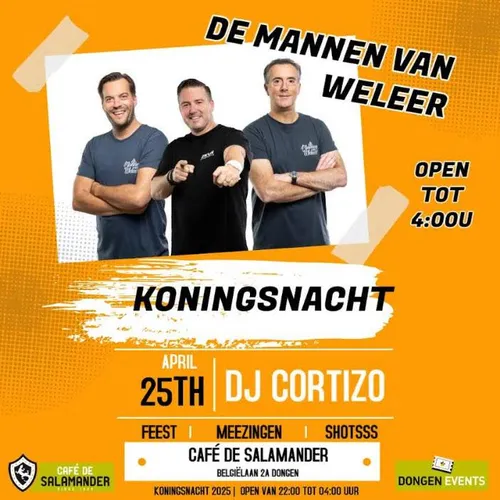 Vanaf het moment dat de laatste noot op het festivalterrein klinkt, openen de deuren van De Salamander voor iedereen die nog niet naar huis wil. En geloof ons: dat wil je niet. Met DJ Cortizo achter de draaitafels en de energieke Mannen van Weleer live op het podium, is er geen ruimte voor slaperige ogen of zere voeten. Tot 04:00 uur wordt het één groot feest, met goede beats, meezingmomenten en – uiteraard – gouden shotkansen voor de dorstige feestvierder.