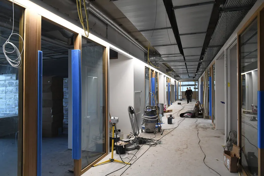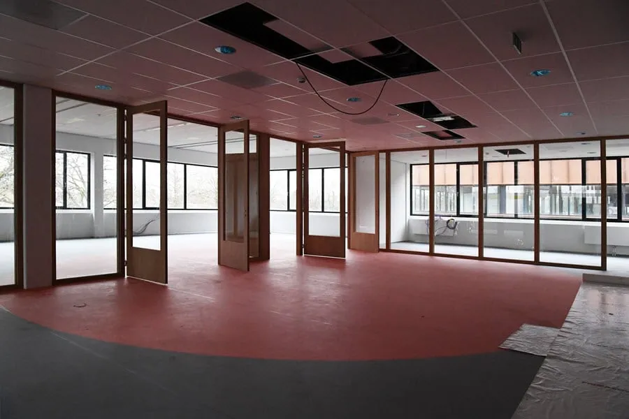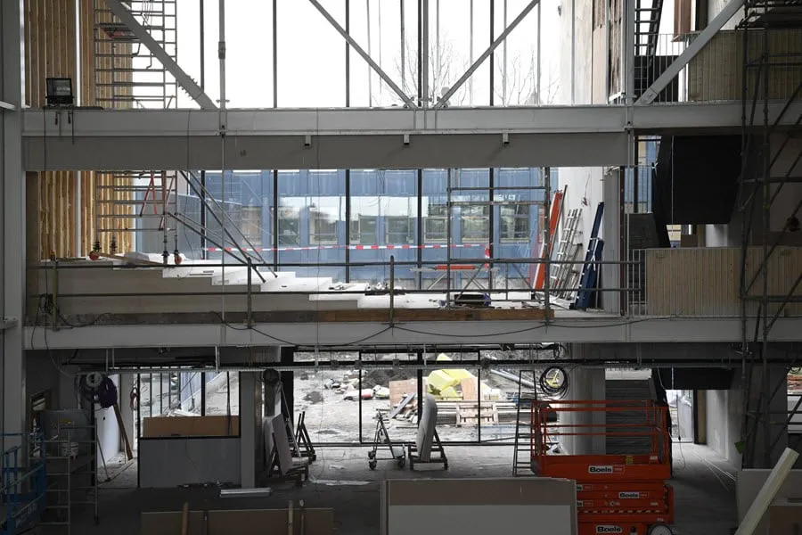 De aula oogt zonder meer indrukwekkend en bevindt zich in een enorme ruimte met een hoogte van elf meter en ook hier veel daglicht. "Dit wordt het hart van de school waar de leerlingen kunnen samenkomen." We zien een soort van tribune waar de leerlingen hun pauzes kunnen doorbrengen. "Vanuit elke hoek heb je hier een prachtig uitzicht over de omgeving" aldus Bram Thielen. "Het wordt nog ingericht met gezellige zitjes en er is zelfs een aparte ruimte voor de leerlingenvereniging."