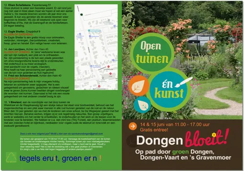 Laat u verrassen door vaak verborgen tuinen, midden in het centrum of een oase van rust in het buitengebied, en verwonder u over de bijzondere vormen van kunst die bewoners uit Dongen te bieden hebben. Hopelijk krijgen we heel Dongen en omstreken in beweging.