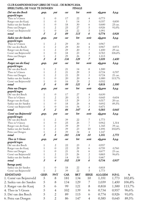 Corné toonde zich hierin de beste en won in 22 beurten en werd hierdoor de nieuwe clubkampioen libre, proficiat