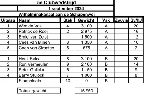 De gewichten waren niet om naar huis toe te schrijven maar we moeten het er mee doen. Twee deelnemers wisten deze wedstrijd te winnen niet om dat het een koppelwedstrijd is maar zij hadden allebei precies hetzelfde gewicht en zaten ieder in een ander vak Henk Bakx zat in vak B en hij wist 3100 gram bij elkaar te vangen en Wim de Vos wist in vak A hetzelfde te vangen helaas gooide die ook nog een vis naast zijn bewaarnet en daar ging de overwinning.
