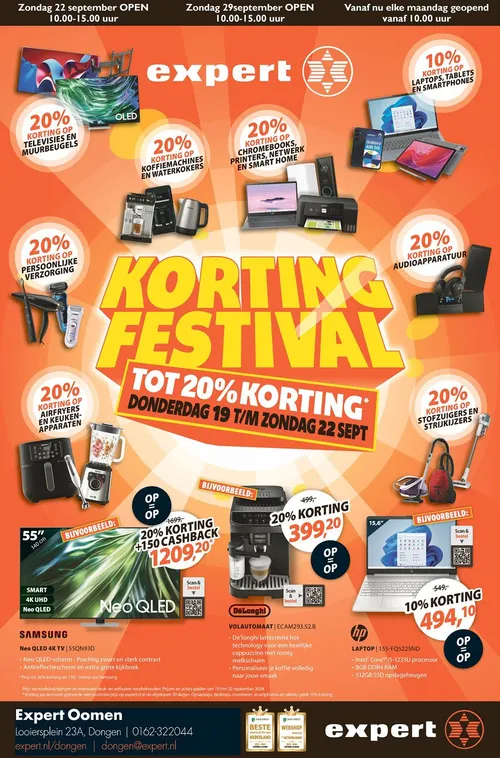 Vanaf donderdag 19 september t/m zondag 22 september en donderdag 26 september t/m zondag 29 september profiteer je tijdens het Korting Festival bij Expert van hoge kortingen op heel veel producten! Aanstaande zondag 22 september kun je bij Expert ook terecht van 10.00 tot 15.00 uur en vanaf maandag 23 september is Expert voortaan ook open op de maandagochtend vanaf 10.00 uur.